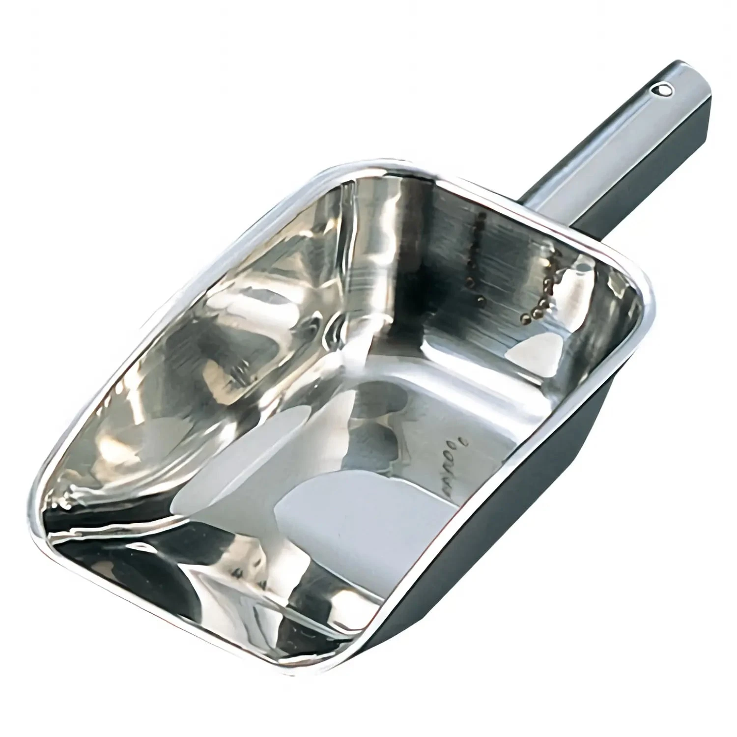 - An ice scoop made of stainless steel.